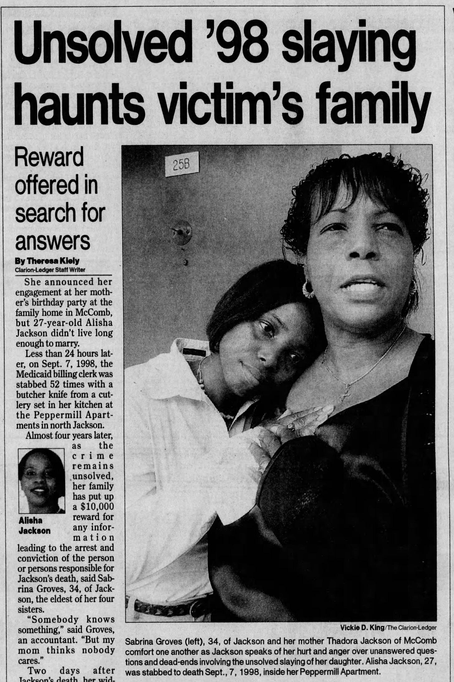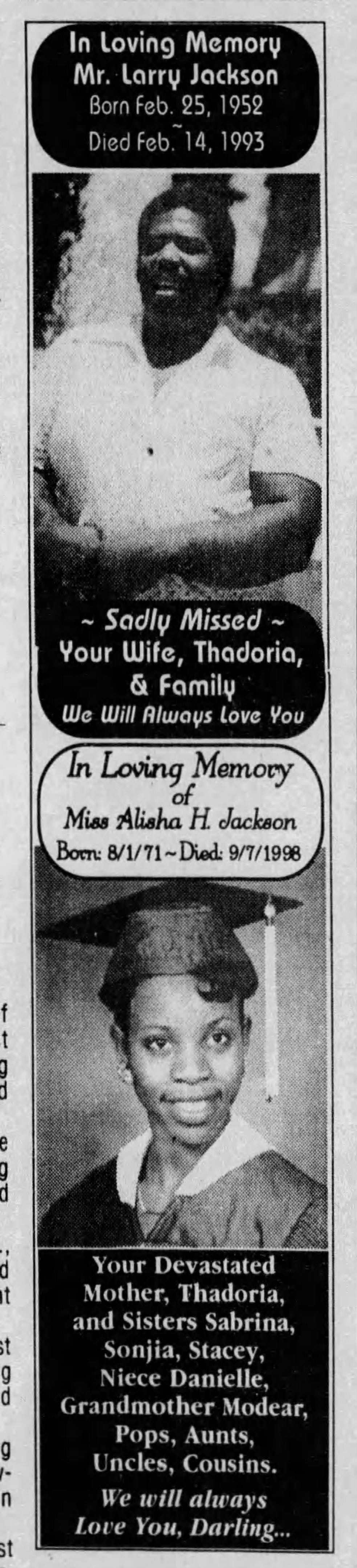 Every year, on Alisha’s August 1 birthday, Thadoria and her daughters placed a memorial in local newspapers. Some years, a small poem ran alongside Alisha’s photo. In others, her tribute appeared near one for Larry Jackson, her father, who died in 1993.