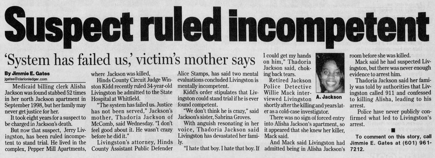 In November 2009, Hinds County Circuit Judge Winston Kidd officially declared Livingston mentally incompetent. He would remain at the State Hospital at Whitfield and would not face charges for Alisha Jackson’s murder. Judge Kidd did stipulate that if Livingston was found competent in the future, he could still stand trial.