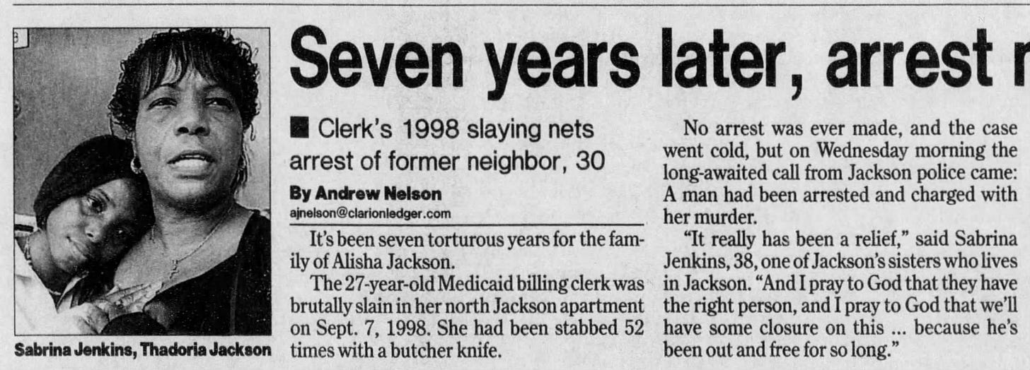 On March 15, 2006, more than seven years after Alisha was murdered, Thadoria received a phone call from the Jackson Police Department. A suspect in Alisha’s case was under arrest.