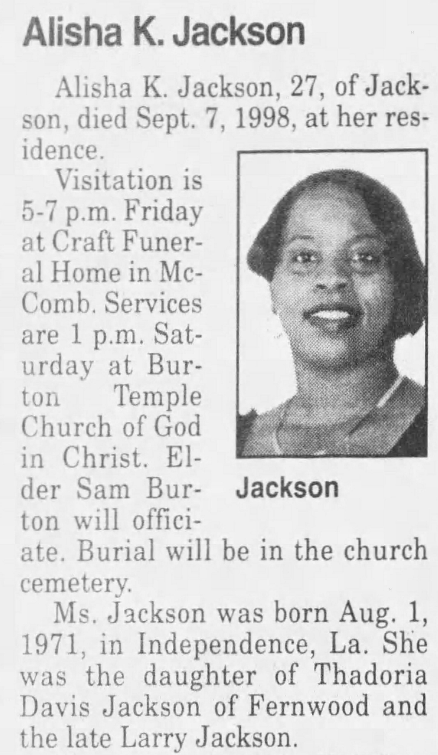 In August 2009, two months before Livingston was officially ruled incompetent to stand trial, Thadoria published a memorial for Alisha in McComb’s Enterprise-Journal: