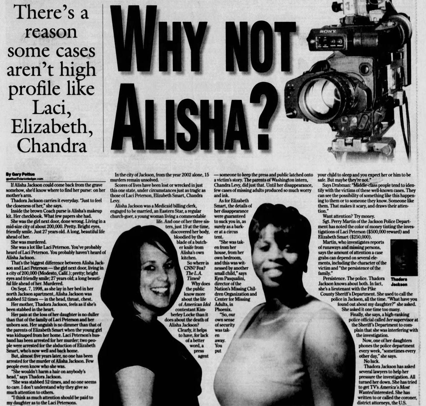 Meanwhile, Thadoria found that cases with similar characteristics, though “higher-profile” victims, were gaining nationwide attention. In the years following Alisha’s murder, the nation became captivated by Chandra Levy, Laci Peterson, and Elizabeth Smart—cases that consumed the media’s relentless attention and drew rewards of $250,000 to $500,000 or more, dwarfing the $10,000 the Jacksons offered.