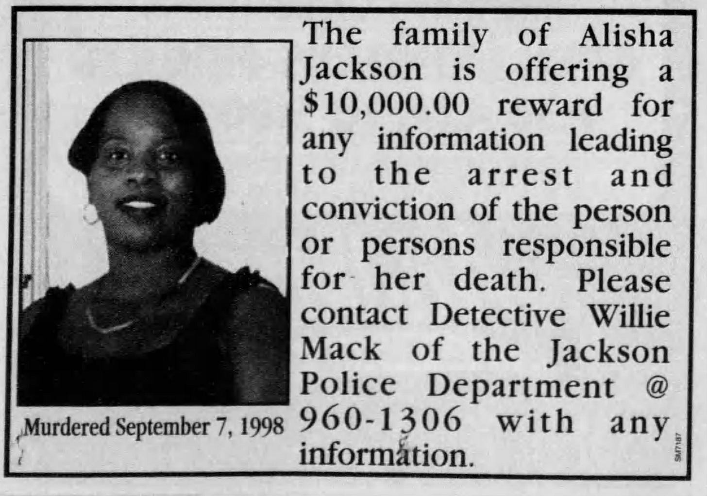 Mack believed robbery wasn’t a motive in Alisha’s death, as nothing appeared to be missing. And with no sign of forced entry, it seemed that Alisha may have known her attacker. But that didn’t narrow the field enough, and as 1998 closed, Alisha’s death became one of 64 homicides in Jackson that year.