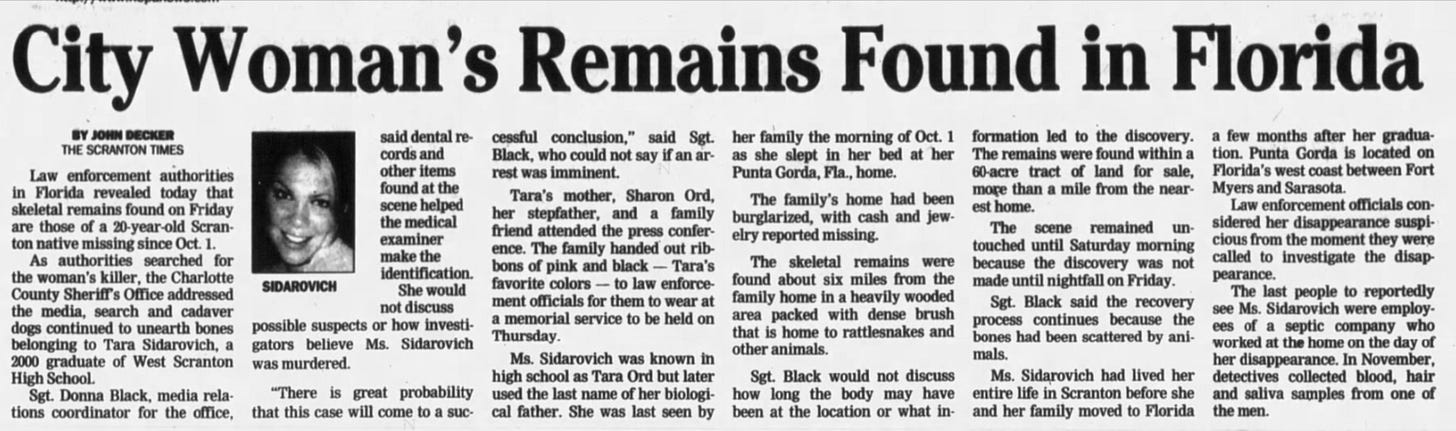 Eventually, dental records and a belly button worn by Tara Sidarovich confirmed that it was the missing 19-year-old. Authorities canvassed the area, but recovered fewer than half her bones. They couldn’t determine her cause of death, but did identify markings consistent with trauma to her ribs, suggesting that she had struggled mightily during the attack that ended her life.